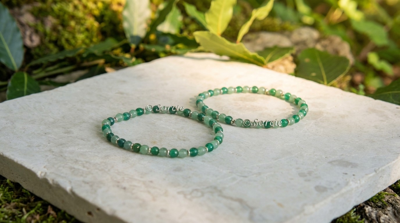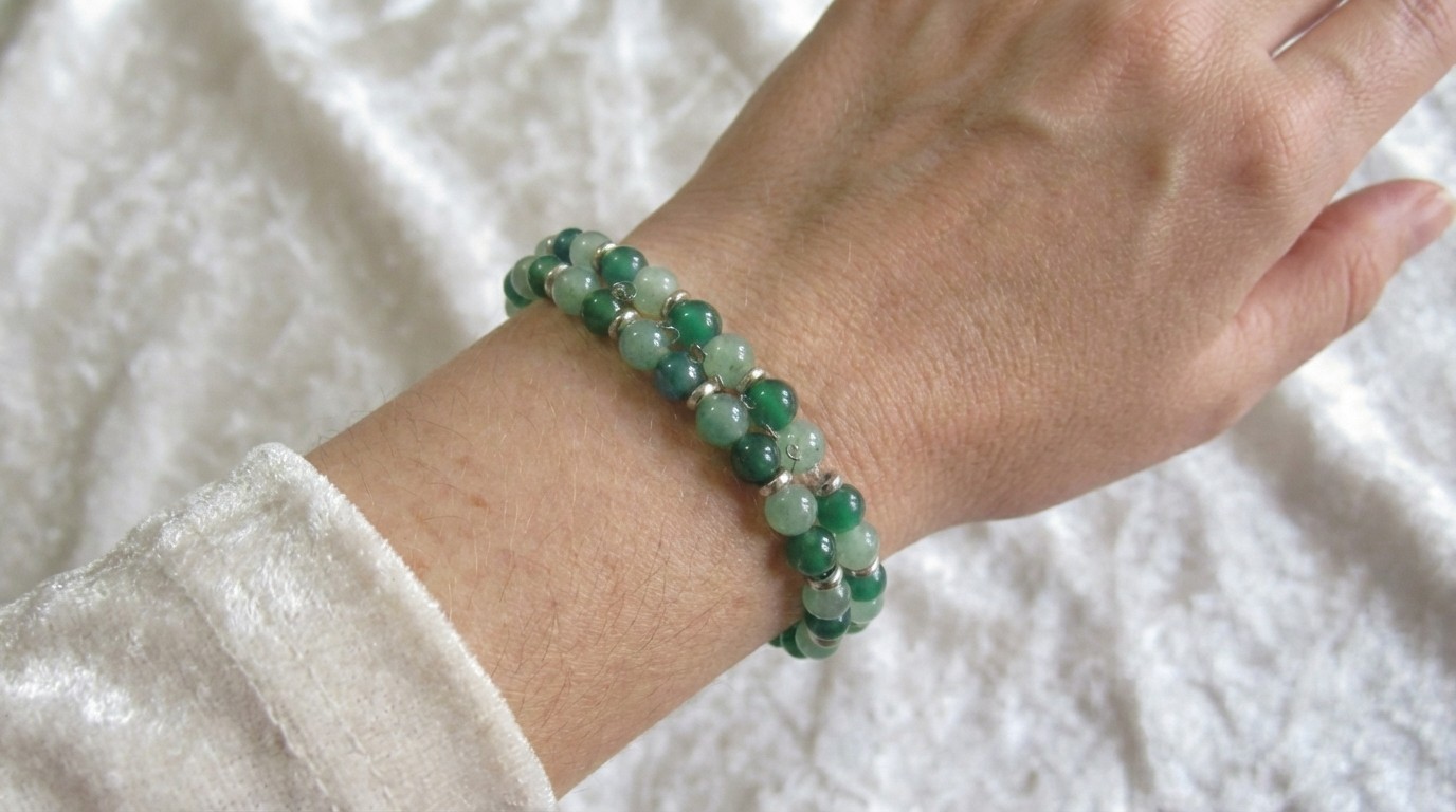 Petites billes d'agate et d'aventurine, montées sur fil élastique.