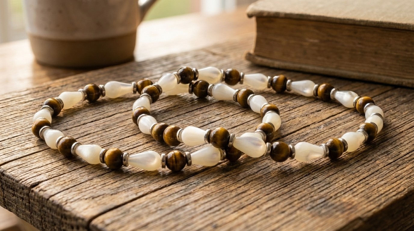 La force de l'oeil de tigre réhausse la douceur de la nacre.