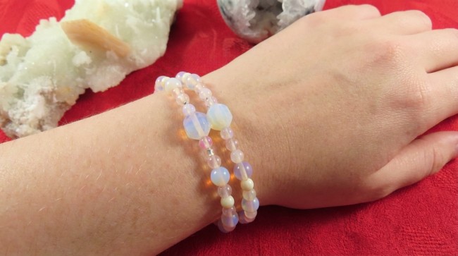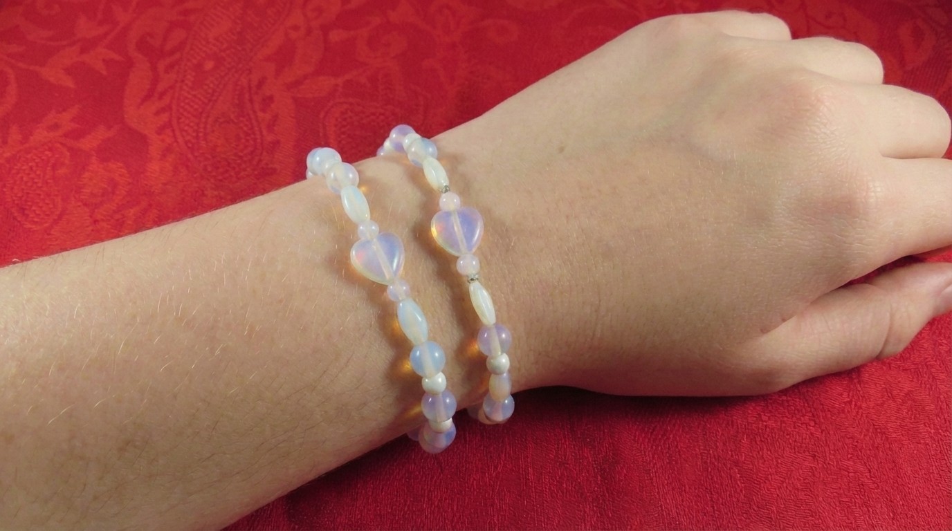 Cœurs et sphères d'opaline, mélangés à des olives de nacre et de petites billes de howlite, suspendus sur un fil élastique comme un trio de pierres en douce harmonie.