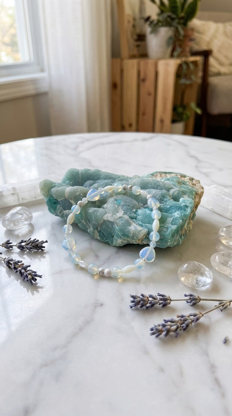 Ensemble, ces trois pierres se répondent avec grâce : les reflets changeants de la nacre se marient à la transparence rêveuse de l'opaline, tandis que les veinures délicates de la howlite viennent poser une note plus mate sur ce tableau de douceur.